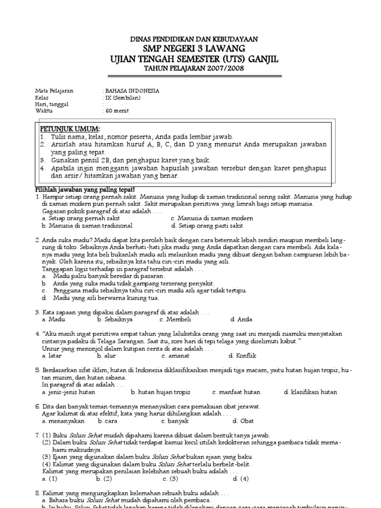 20190313 Download Soal UTS BAHASA INDONESIA Kelas 6 Semester 2 K13 Revisi 2018. Soal UTS Bahasa Indonesia Kelas 9 Semester Ganjil. Try Out UN Online Bahasa Indonesia Kelas IX SMP 186664 X.